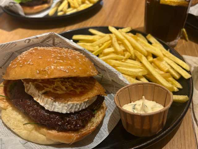 - Carne de vaca, queijo de cabra, agrião, mel e molho de mostarda