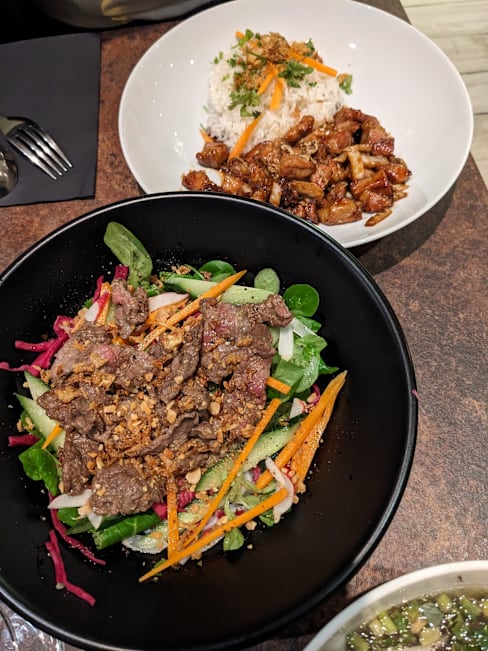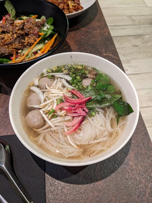 9/10Overall good experience. We ordered 1) pho with beef slices and additional beef ball. The soup base had a very strong cinnamon smell but didn't taste it, and soup was clear and flavorful. No line wedge and additional cilantro on the side though. The beef slices were on the thicker side, so were the rice noodles (but I liked the chewy texture). 2) Vietnamese salad (actually it's like bun) with beef. I like this dish the best because it used both cooked and raw garlic, created layers of flavor and texture. 3) Rice bowl with crispy pork belly. It's quite sweet for my taste, but wife liked it a lot for the flavor and texture. It's not really "crispy" per se since it's not deep fried, I'd say it's more on the crunchy side and the pork had to be quite fresh to achieve that.
