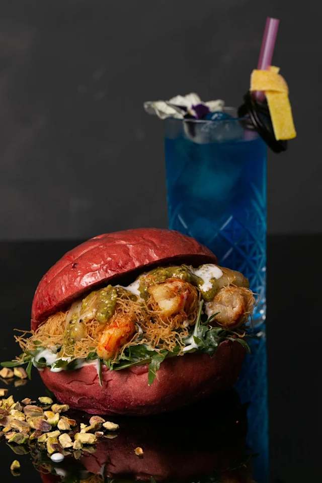 - Hamburger di scottona da 200gr, rucola, pomodori secchi, stracciatella di bufala, mayo al lime e pesto di pistacchi