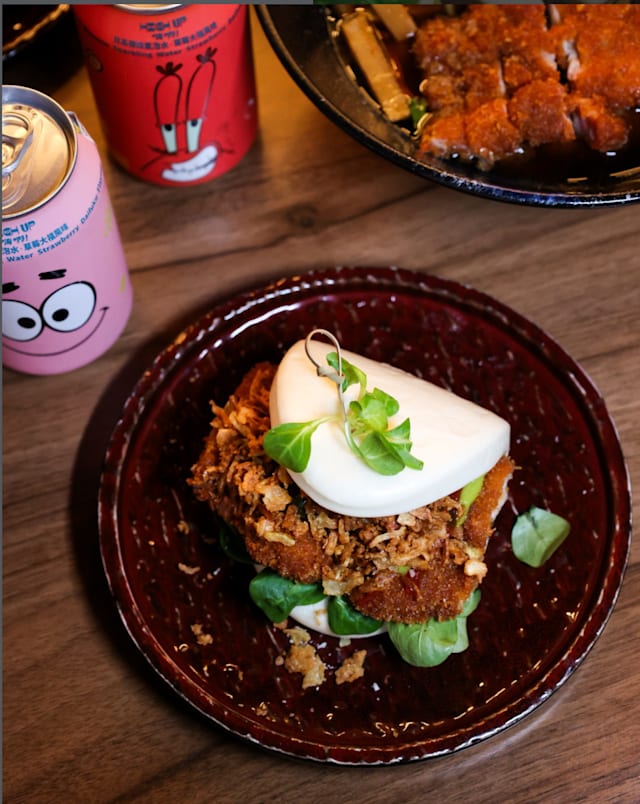 - Pane al vapore* con tofu, spinaci, peperone, burrata, salsa tonkatsu
