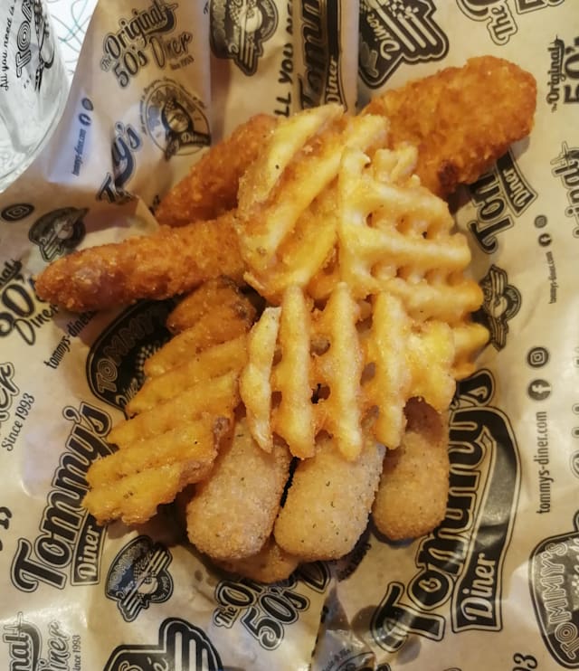 Assortiment composé de chunky chicken, de southem fries, de mozzarella sticks et d'onion rings.