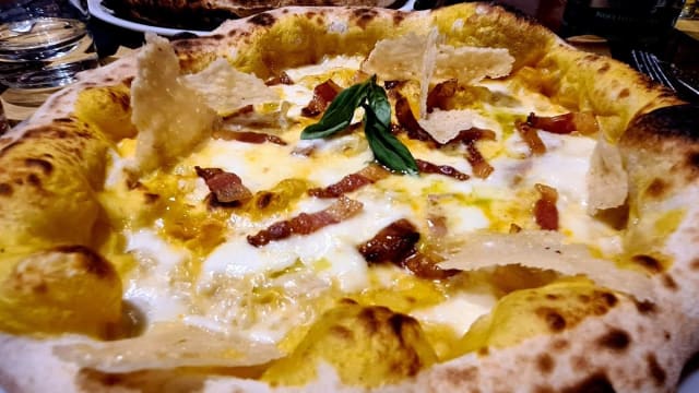 Pumpkin cream, fior di latte dei monti, sausage, black pepper, taleggio cream, toasted almonds, basil and extra virgin olive oil