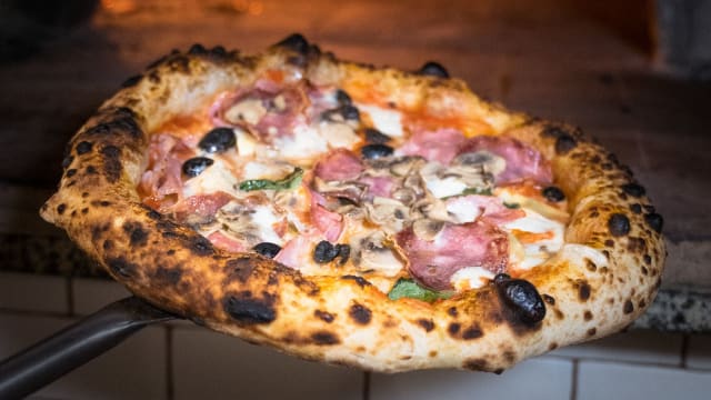San marzano DOP tomato, fior di latte from monti lattari, diamante culatta selection villani, champignon mushrooms, taggiasca olives, napoli salami, roasted artichokes, grana flakes on exit, extra virgin olive oil