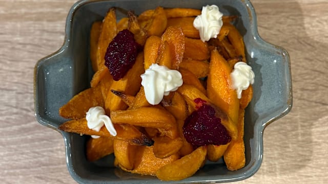 - Baked sweet potato fries served with beetroot ketchup,plant based aioli and coriander/ frites de patate douce au four, servies avec un ketchup de betterave, une aïoli végétalienne et de la coriandre