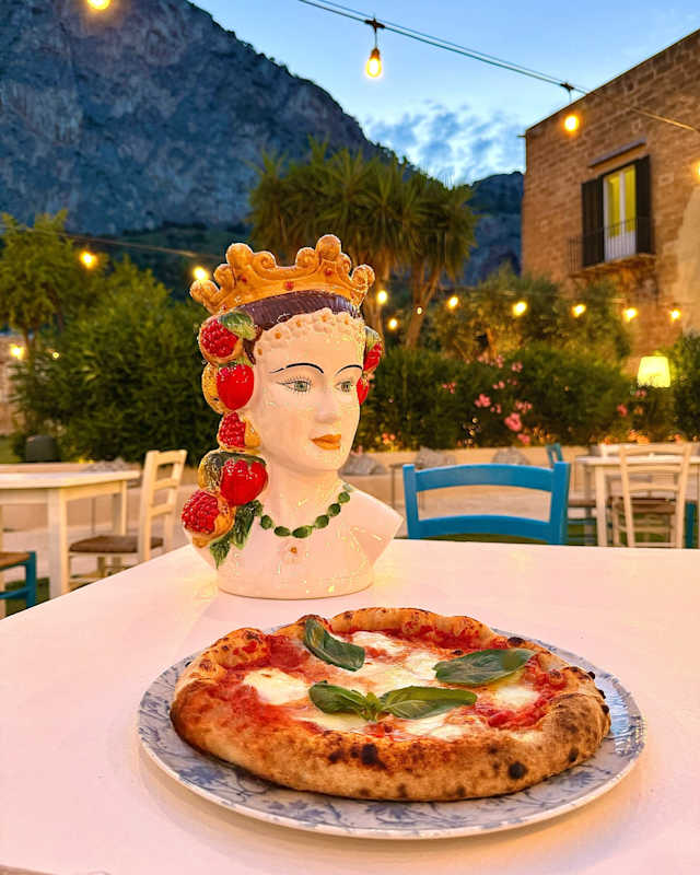 - Salsa di pomodoro, mozzarella campana, salame piccante di suino nero siciliano, basilico fresco e olio evo