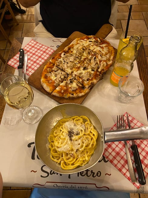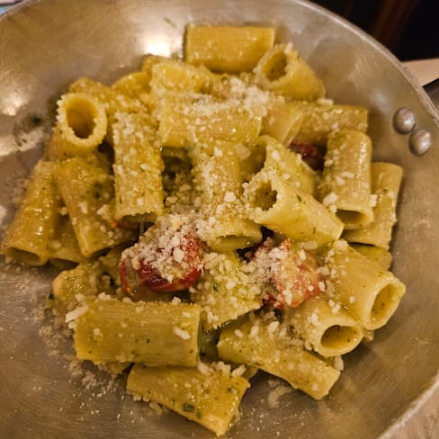 8.5/10Great pinsa the best I had in the city.Average carbonara and cacio & pepe rigatoni. Service quick and friendly.