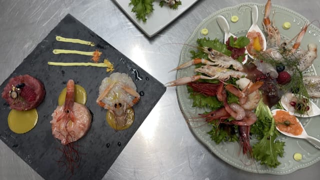 Zuppa di pesce composta da cliente con il pescato in vetrina o plateau del giorno.
