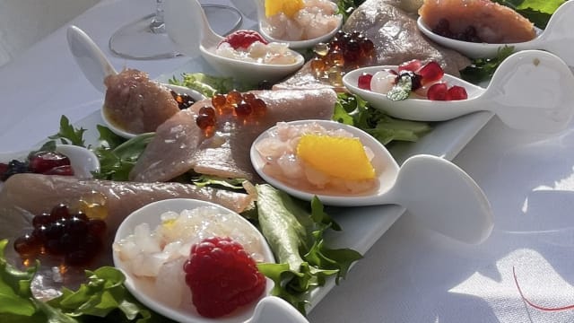 Pesce di stagione scottato al cannello e tagliato finemente a carpaccio, servito con quenelle di crema di zucchine al basilico e nuvole di bottarga e marmellate di stagione