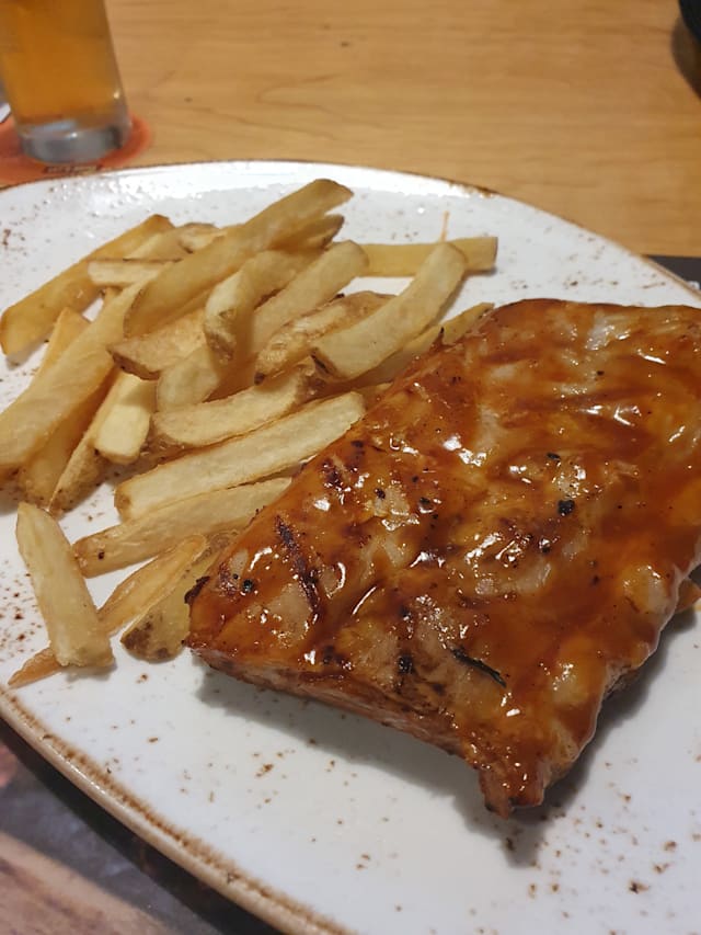 Waitresses were really nice, convenient parking within the building, prices with promotions very good value. Starters and Burgers tasty, just the steak was over cooked