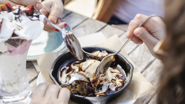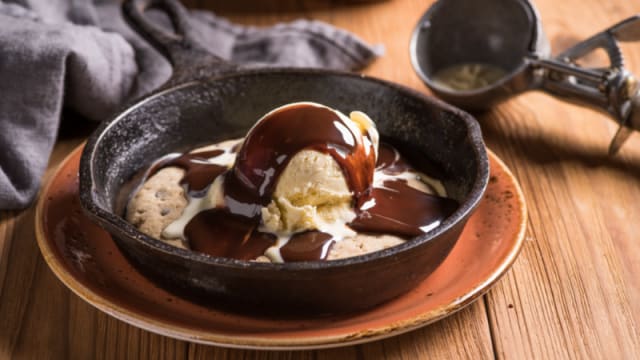 Classic cookie sundae con chips de chocolate. Muchas veces imitada, ijamás igualada! Deliciosa cookie hecha al momento, servida en nuestra sartén skillet, coronada con helado y goloso chocolate caliente.