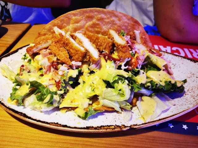 ¡Nuestra ensalada más top! Lechuga, pechuga de pollo enujiente, crispy bacon, quesos cheddar y gouda y tomate cherry con aderezo de salsa de mostaza dulce. Lo mejor, todo dentro de una tortilla crujiente