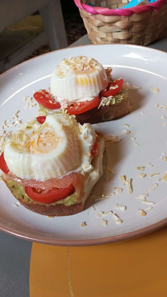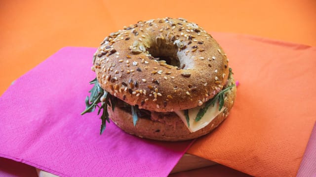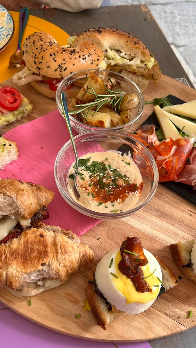Dolce a scelta + bagel o croissant + verdure dl stagione e insalatina composta hamburger dl ceci o hummus, mozzarella vegan, scramble dl tofu con curcuma e patate al forno con mayo vegan, frutta secca, frutta fresca, una bevanda a scelta e coperto incluso