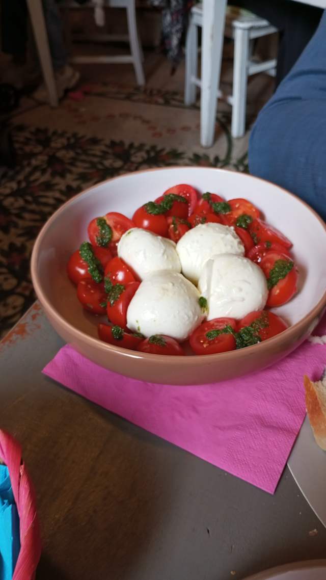Caprese con mozzarella di bufala, pomodorini e pesto di basilico