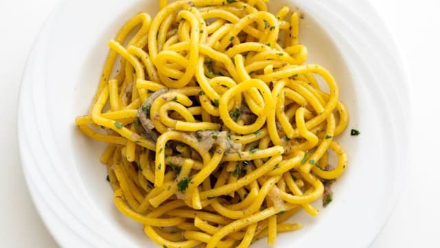 Spaghetti* freschi alla chitarra con vongole della laguna e bottarga di muggine