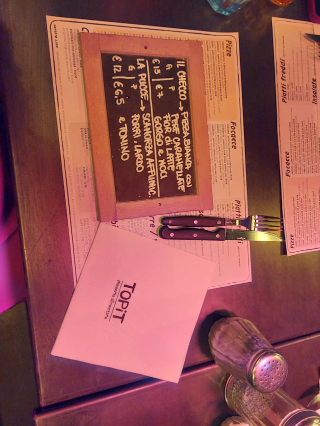 10/10We’ve been staying in Turin for a month. Topit is one of our top 3 restaurants in the area. Every dish we’ve ordered is outstanding! The service and prices are fantastic! Love that I can order a small pizza and my husband can order a large one. The pizza with sauce, mozzarella, spicy salami, and olives is my absolute favorite!!!!!!