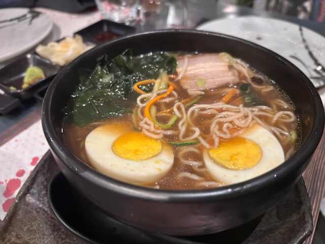 - Spaghetti giapponesi all'uovo in brodo di carne e soia, con uovo sodo marinato, germogli di soia e alghe