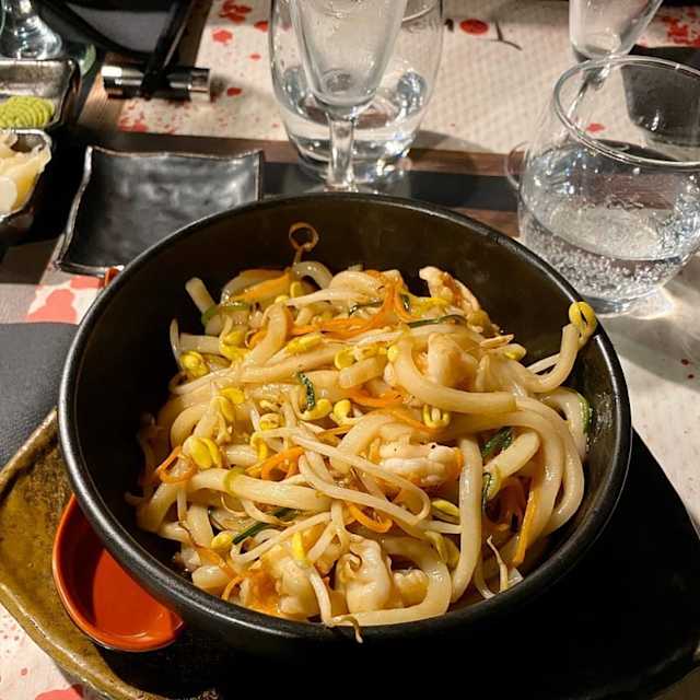 - Tagliatelle di riso tailandesi saltate al wok con gamberi, capesante e germogli di soia al profumo di menta e coriandolo