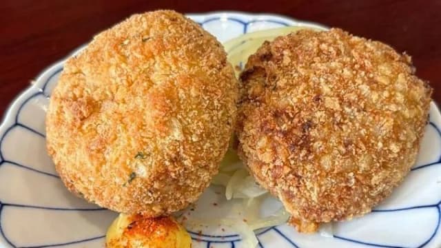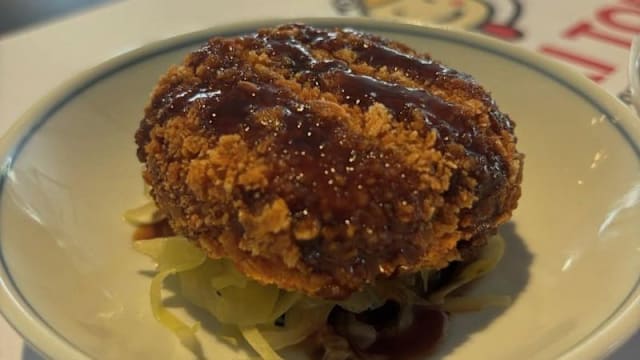 Crocchetta di patate e manzo, con salsa tonkatsu e cavolo