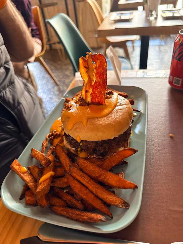 - Versión de la mejor cheeseburger de España: pan brioche rojo, 120g de carne de vacuno de La Finca Jimenez Barbero, crema de queso agria, cebolla caramelizada, mayonesa de trufas, virutas de bacon y salsa casera de queso cheddar