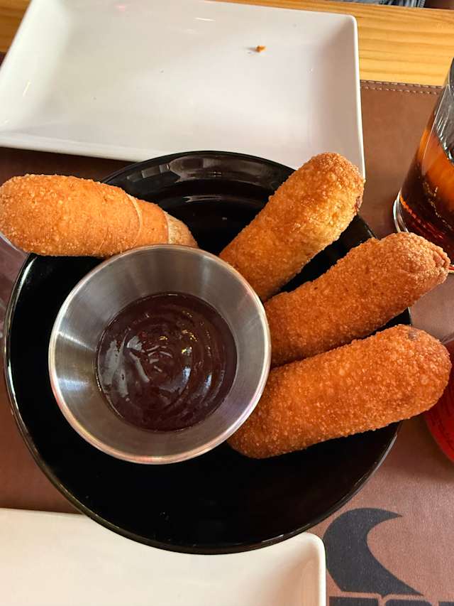 - Bolas rellenas con rib cremoso, rebozadas súper crujientes y servidas con nuestra original salsa Bourbon (mayonesa de chipotle con Jack Daniel's y miel). Trae 8 unidades (media ración 5€)