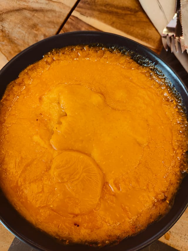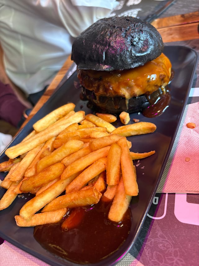 Pan de arándanos con zanahoria, nuestra salsa bbq spicy-whisky, carne heura 115gr, doble bacon vegano, cebolla caramelizada, doble cheddar vegano derretido al vapor de cerveza y flambeado en la mesa