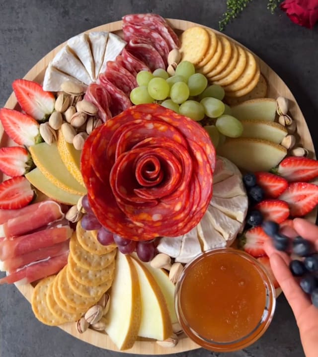 Bladerdeeg gevuld met gekruide fetakaas, gegrilde groente, bladerdeeg gevuld met champignons en kaas, jalapenos: peper gevuld met roomkaas, rolletjes van aubergine gevuld met mozzarella, manchegokaas met vijgenmarmelade