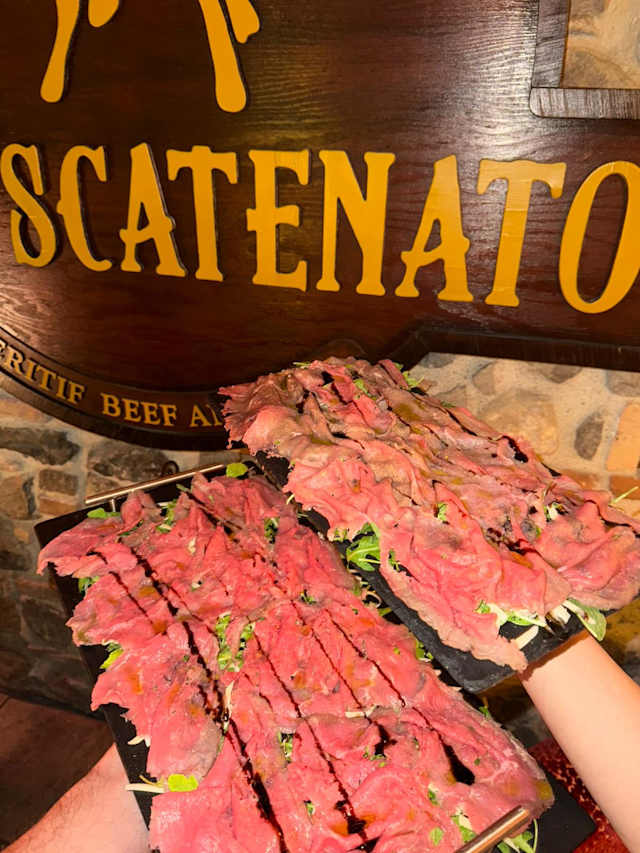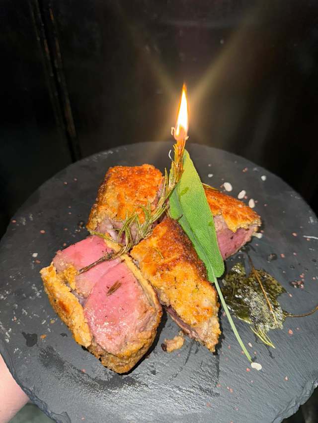 - Succosa carne di Fassona Piemontese, su letto di rucola, condita con sale rosso delle Hawaii, glassa di aceto balsamico di Modena IGP e olio extravergine di oliva