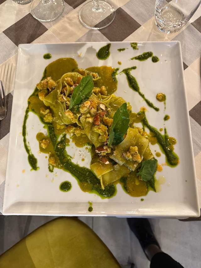 - Pici freschi, erborinato e pecorino delle balze volterrane con scaglie di parmigiano reggiano 24 mesi e estrazione di pepe nero