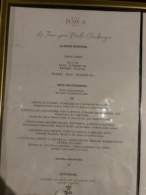 Dear Tony Montalto, Thank you so much for your kind words! We’re thrilled to hear you enjoyed the Chef’s tasting and found the ambiance just right — it means a lot to us. Your recommendation is truly appreciated, and we hope to welcome you back soon for another delightful experience. Grazie mille! Benoit Saudemont Maitre de maison Ristorante Tosca - Relais & Châteaux - Paris 8