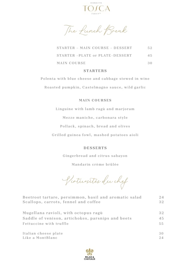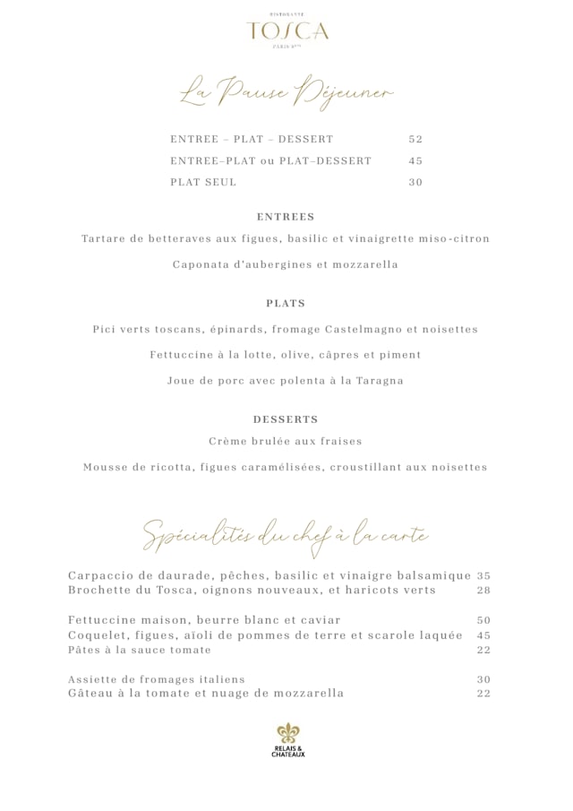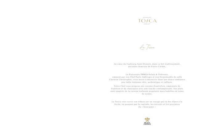 Dear Guest, Thank you for your nice feedback! We are very happy to read that you enjoyed our italian cuisine and our service. We hope to welcome you back soon! Kind regards, Benoît Saudemont, Maître de Maison Restaurant Tosca Relais & Châteaux - Paris 8 Faubourg Saint Honoré