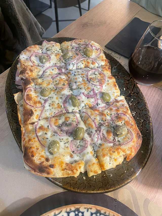 - Massa recheada com prosciutto cotto, mozzarella fior di latte e pecorino romano, acompanhada com cebola roxa, queijo stracchino, azeitonas, azeite virgem extra toscano e orégãos.
