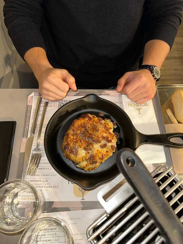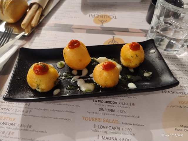 4.5/10I wanted to like this place, but I suspect that, due to our reservation with a discount, they were, let me be polite, relaxed about the food quality. In any case, the food was served suspiciously quickly (it was almost empty because we arrived shortly after opening). That would be great except that the food was barely warm. I think my, and my partner’s, dish would have had more taste if it had been warmer; it you could tell the flavor was there, but the cold just killed it. The service wasn’t unfriendly, but it wasn’t friendly or warm either, which is often such a nice feature of going out in Italy. You can give this place a try if you like potatoes (everything’s potatoes here), I just can’t recommend it based on this single visit. I won’t visit here again in any case.