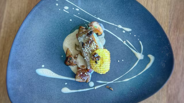 - Pavé de polenta de cottens frit, betteraves glacées, bleu de saint-gall givré, jus de veau rafraîchit à la betterave