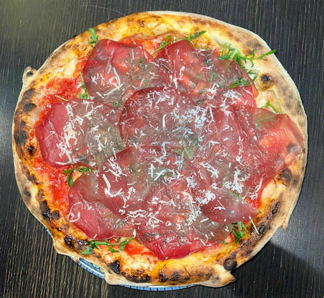 - Pomodoro, fior di latte, bresaola. Rucola, grana e olio EVO