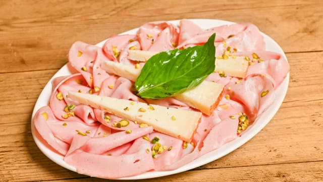 Burrata, mortadela di bologna, pistacho con pesto de albahaca o trufa.