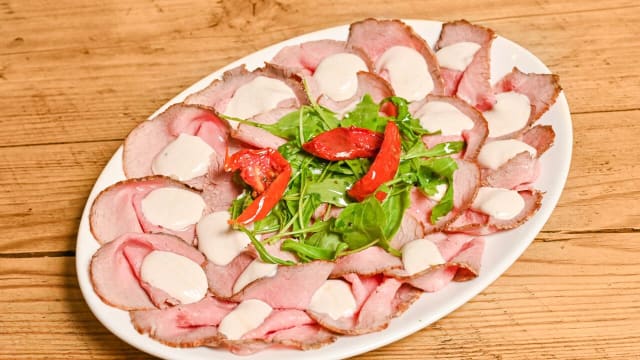En salsa de anchoas, atún, alcaparras, rúcula y tomate semiseco