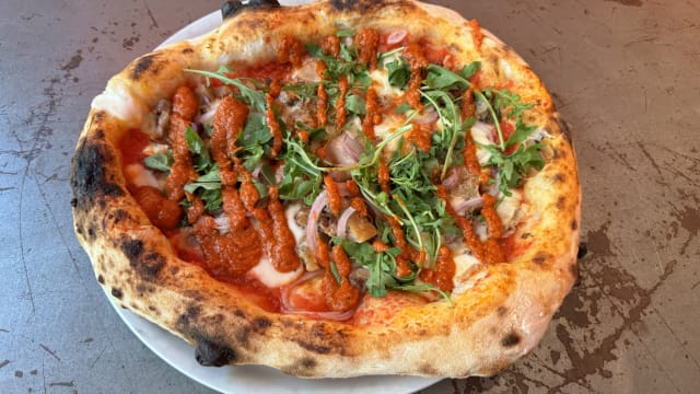 Tomate, mozzarella, cebolla roja, porchetta, scamorza, pesto de tomate y rúcula