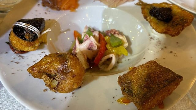 - Polpette di manzo, polpette di polpo, panzerotti di patate, cozze ripiene, alici fritte, chele di granchio*