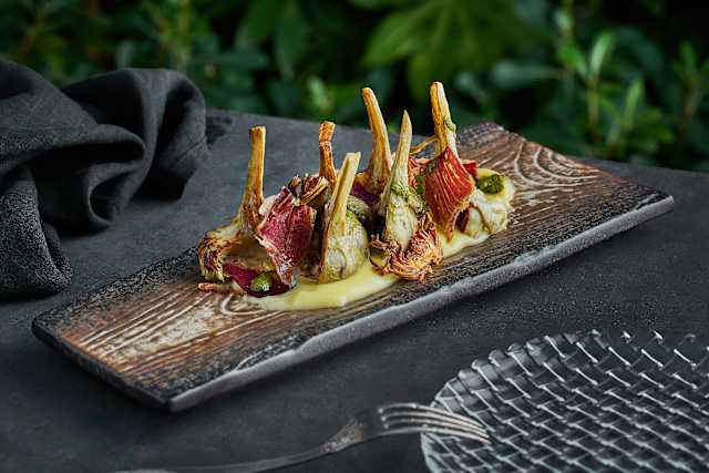 - En adobo anticuchero, sobre cremoso de boniatos y vinagreta criolla
