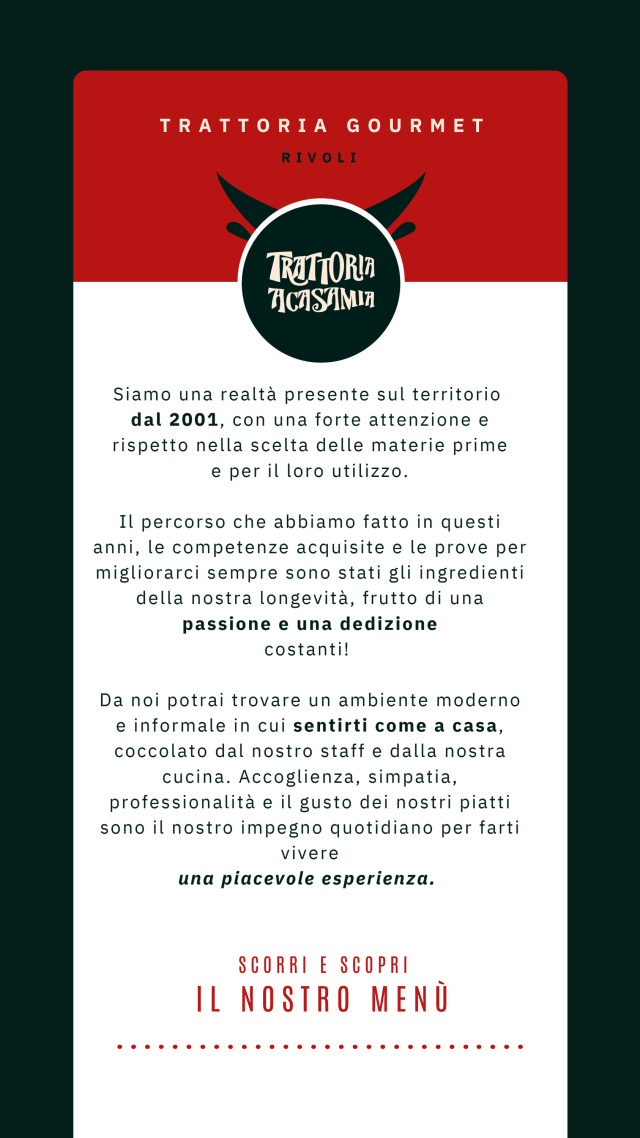 CORDIALITA' - Poco fuori da Rivoli, in provincia di Torino, sorge il Ristorante Trattoria A Casa Mia. Un ambiente cordiale ed accogliente, impreziosito da uno staff giovane, veloce e sempre disponibile ad esaudire le richieste della clientela.