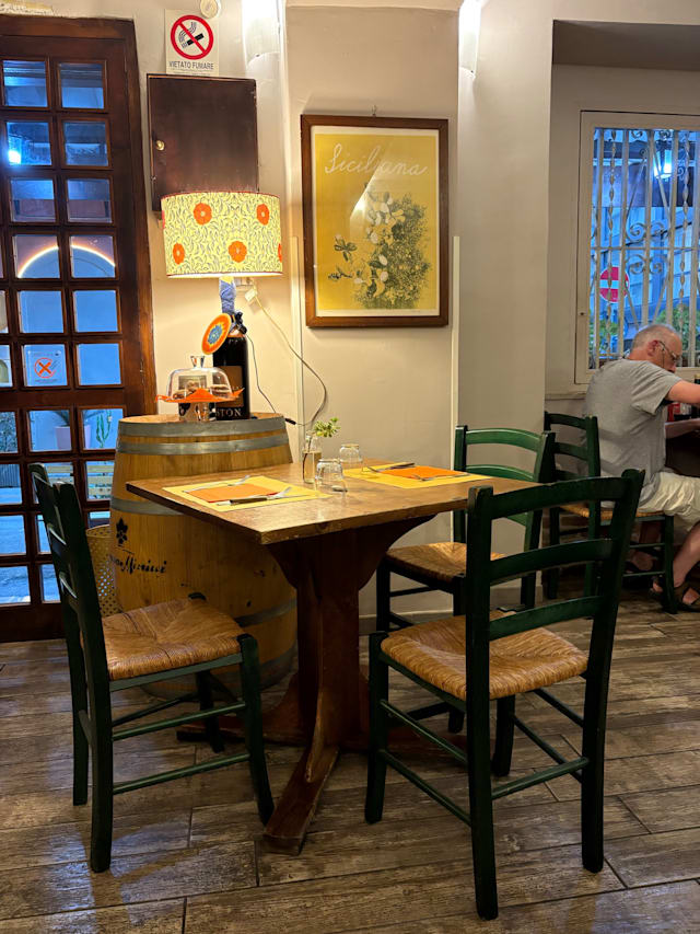 10/10Second time and just as good as the first. The place is cozy, warm, receiving and brightened by the smiling debonnaire service of Valerio. The food is honest, typical Sicilian and the wines complement it perfectly.