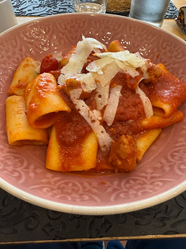 10/10As usual, the pasta was great, amongst the best in Brussels. I took my preferred Paccheri with Sausage, Yannis took the Tagliolini for their condiment with pig's cheeks (guanciale, like bacon, but so much softer). Alessandro handed me a paper bib to protect my suit. We had to leave in a hurry due to meetings and Francesca split the bill in less than a minute. And then we were gone. But we will be back