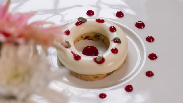 - Bavarese al cioccolato bianco, fondo morbido al limone, gel di mango