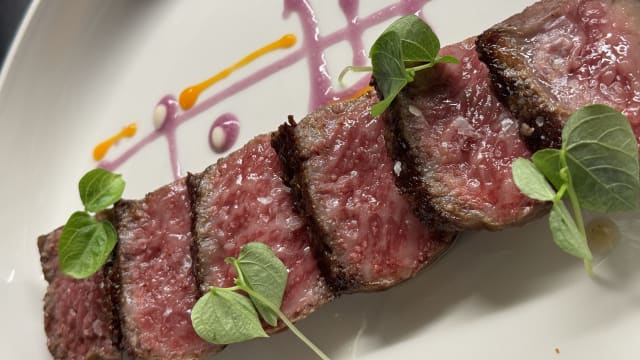 Carne bovina di pura razza wagyu nera cui si ottiene la carne kobe beef. Essendo allevata in spagna ha una marezzatura di colore più dorato e un gusto più lungo e persistente