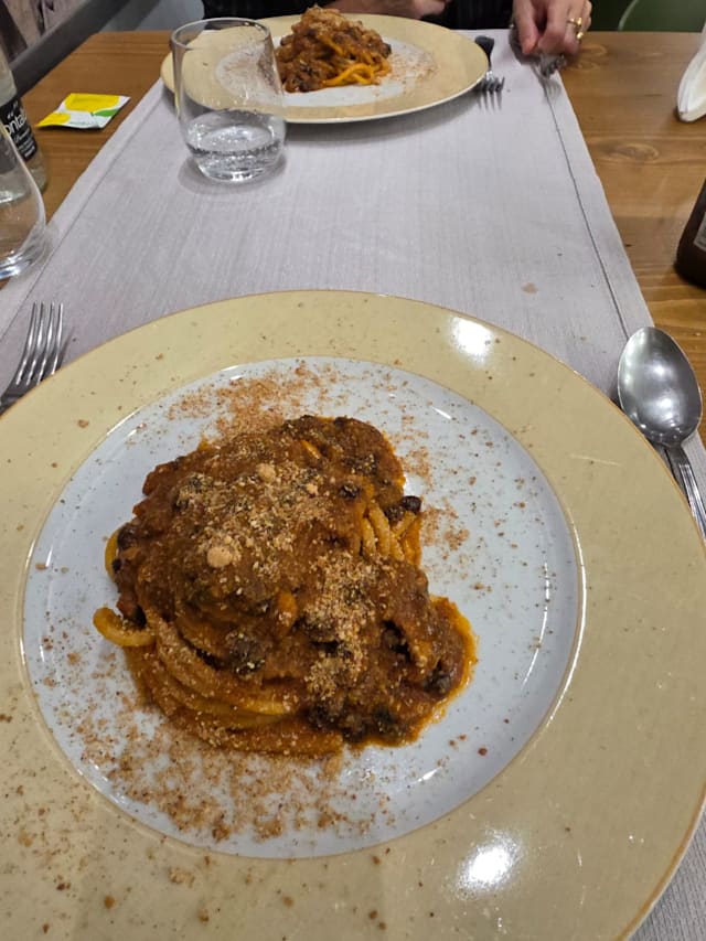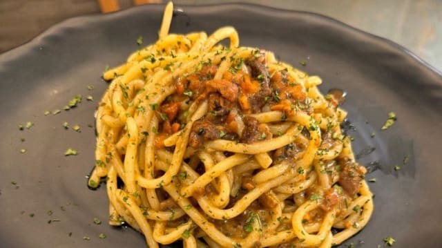 Bucatini di pasta fresca con sarde in rosso, pinoli, uva passa, finocchietto di montagna e mollica "atturrata"