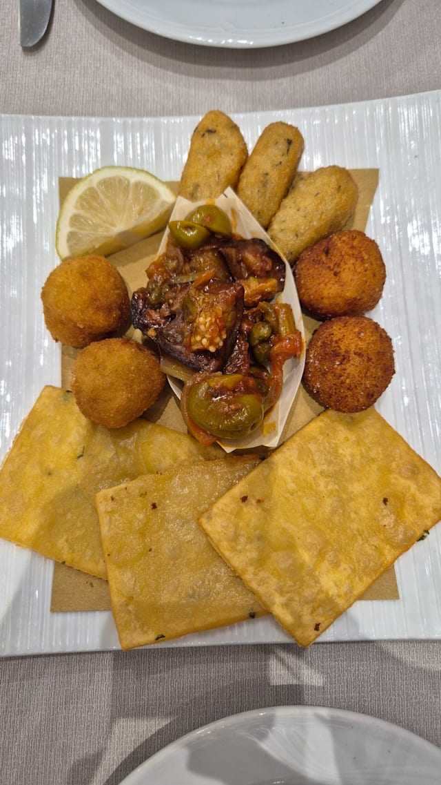 Panelle, arancinette miste, crocchette di patate, patatine e caponata di melanzane