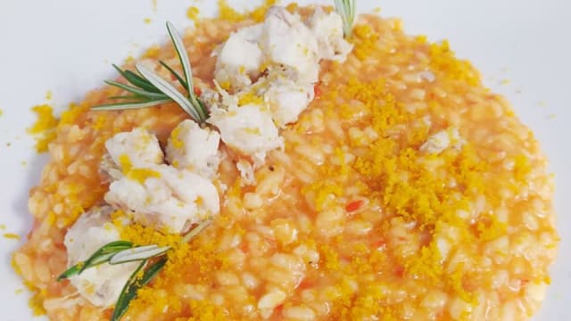 Risotto al radicchio con canestrelli al rosmarino e granella di nocciole