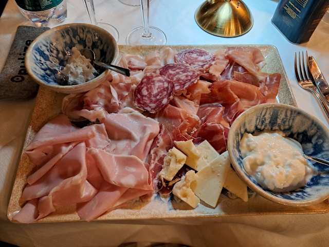 - Mortadella “favola” salumificio palmieri, lardo di colonnata, galantina di faraona di corte galluzzi”, salame felino, prosciutto di parma 30 mesi, la nostra giardiniera, cipolline in agrodolce al balsamico