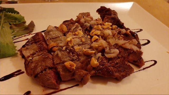 Tagliata di Manzo con Lardo di Colonnata e Nocciole in Salsa di Primitivo