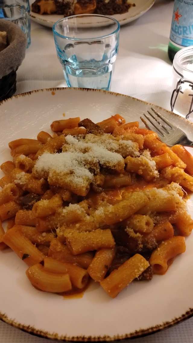 - Rigatoni pasta with tomato sauce, pork cheek and parmesan cheese)(